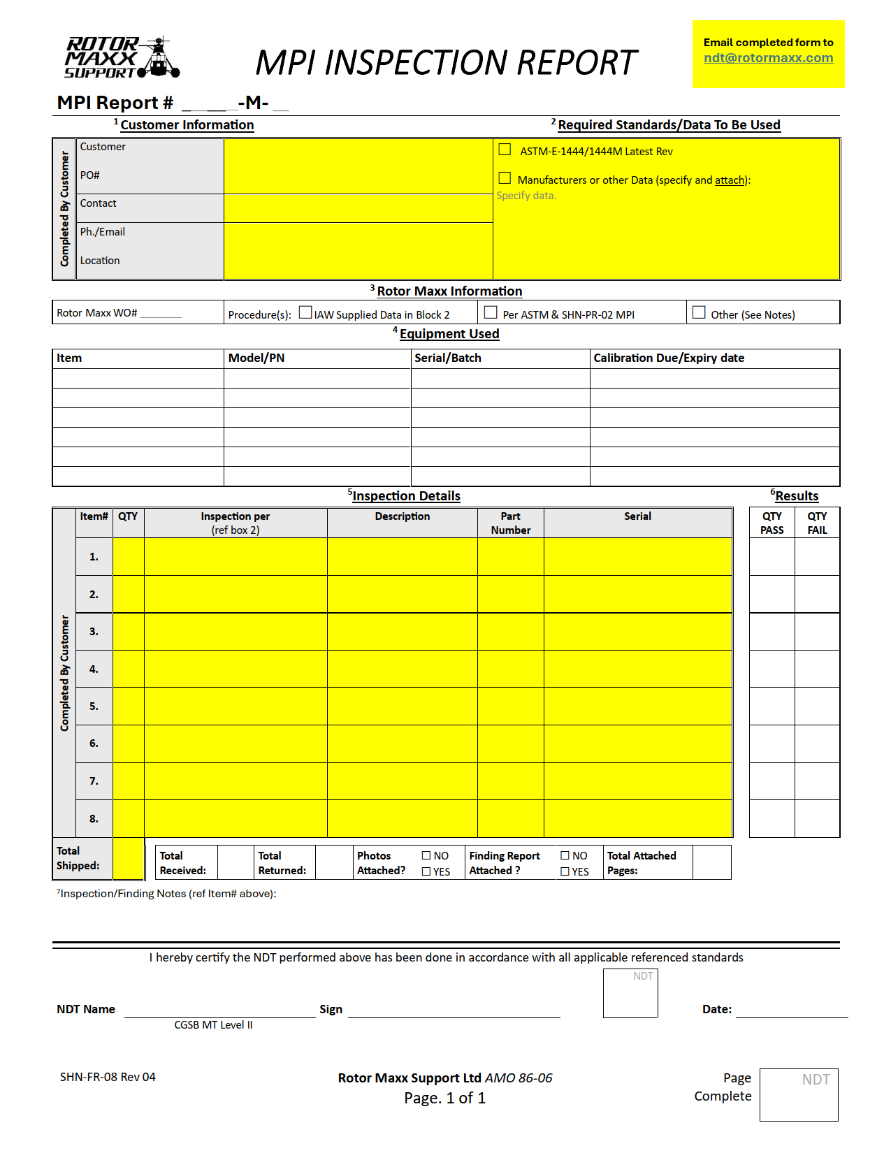 - Customer needs to fill out FORM SHN-FR-07/09 (highlighted areas in example below), email an electronic version to NDT@rotormaxx.com and include a printed copy with their parts